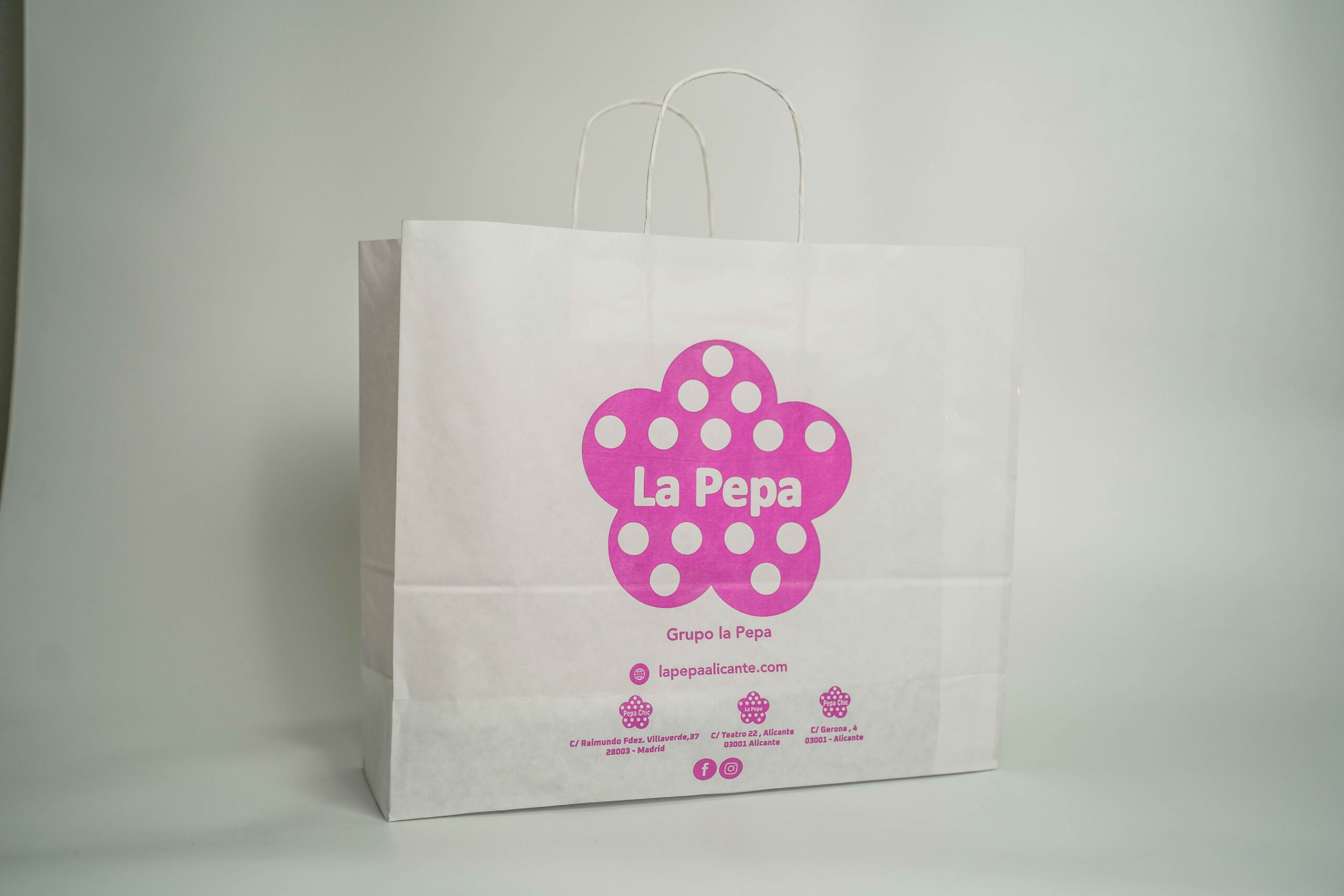 Bolsa de papel celulosa blanco y kraft, con un gramaje de 100 y asa retorcida . Con un diseño elegante y práctico, nuestras bolsas son la opción ideal para tus necesidades de empaque. Fabricadas con papel celulosa de alta calidad, estas bolsas son resistentes y duraderas, lo que las hace perfectas para transportar una variedad de artículos.Además, estas bolsas son una opción amigable con el medio ambiente, ya que cumplen con el certificado FSC y son totalmente reciclables.